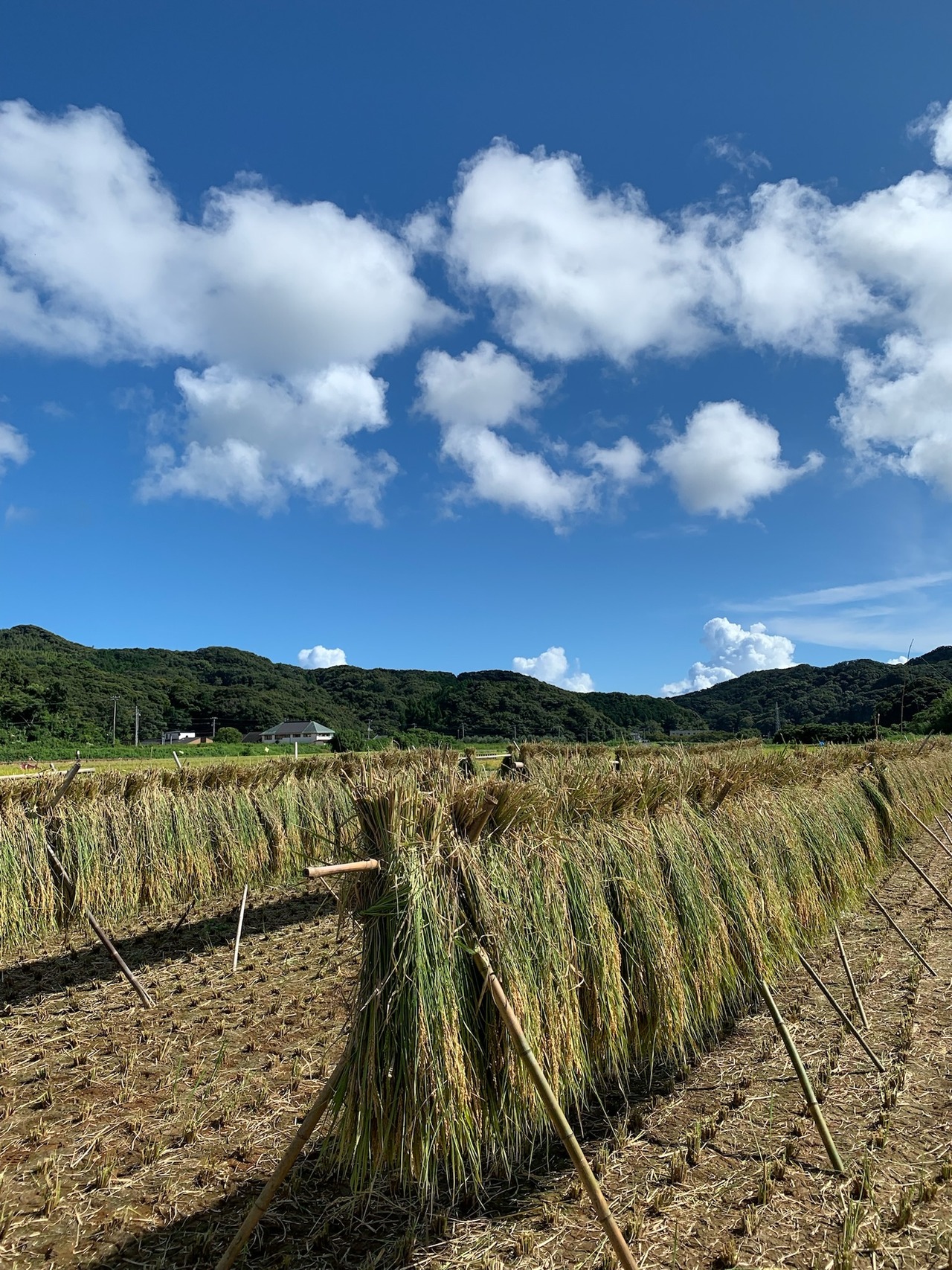 昔ながらの秋の田んぼの風景によくある、稲を掛けて天日干しをしております。